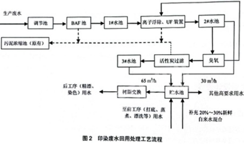 由于印染工艺本身的复杂性和工艺用水水质要求的差异性,目前国内对印朵废水的回用水水质标准没有统一的标准,因此根据本企业车间的具体生产要求确定回用水水质标准,具体水质指标如表2所示。
