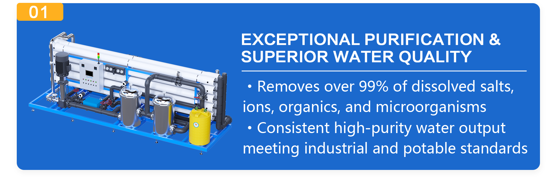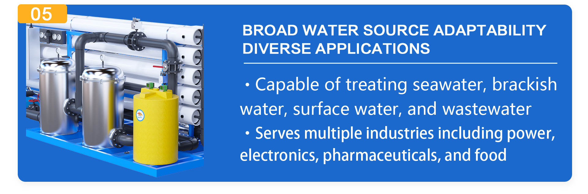 Product application scope:Large-scale industrial water, chemical water, textile printing and dyeing water, electronic industry water, school/community centralized water supply, beverage/beverage water